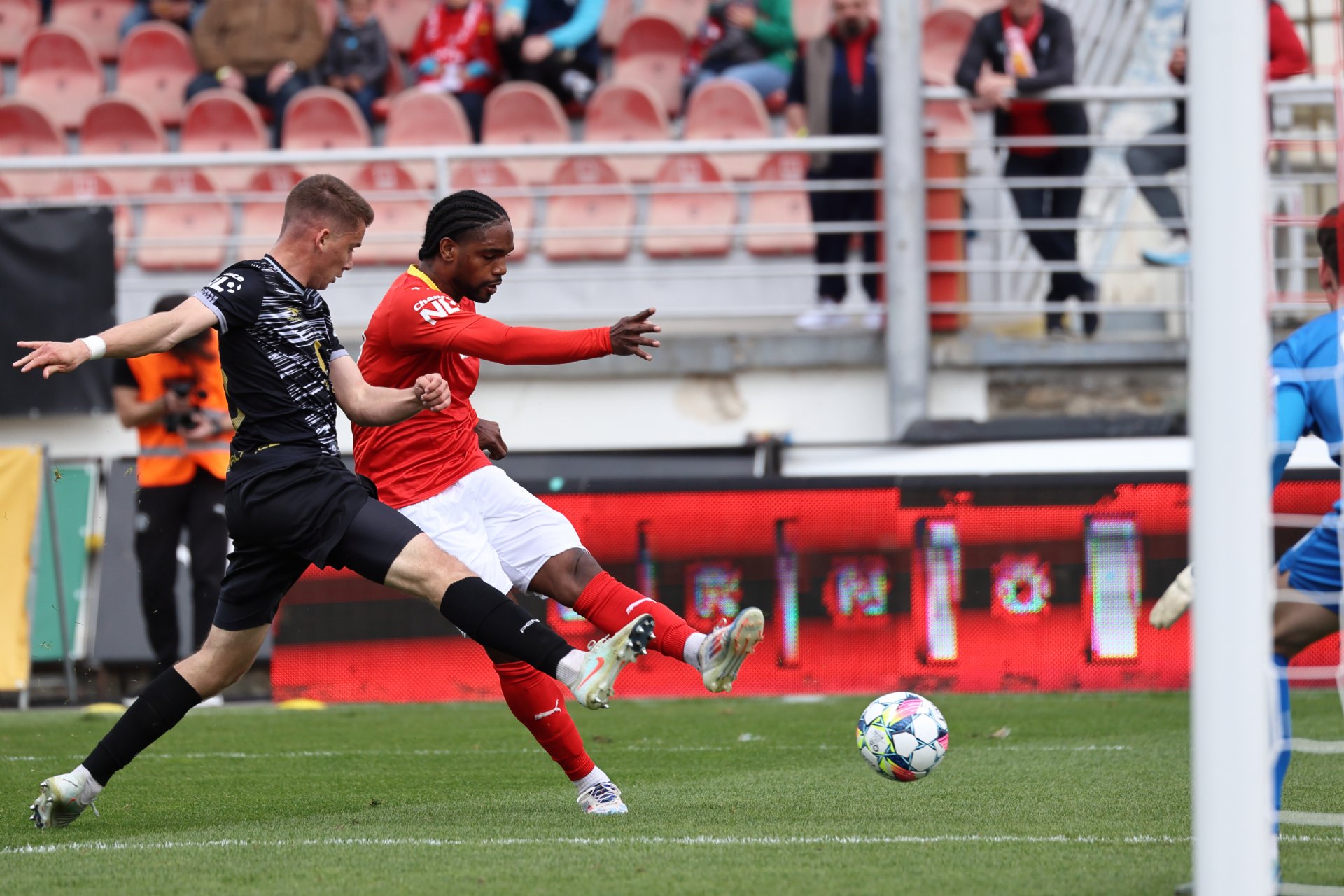 Zbrojovka vstoupila do utkání aktivně. Hned ve 3. minutě adresoval Pachlopník zajímavou přihrávku Vachouškovi, ten ale ideální moment k zakončení prováhal. Na druhé straně o sobě dal vědět Condé, který v dobré pozici hlavou minul bránu. V prvním poločase byl k vidění především boj o střed hřiště s minimem šancí. Výjimkou byl po odehrané půlhodině rychlý brejk Arauja, po němž zakončoval Mackleyther do boční sítě.