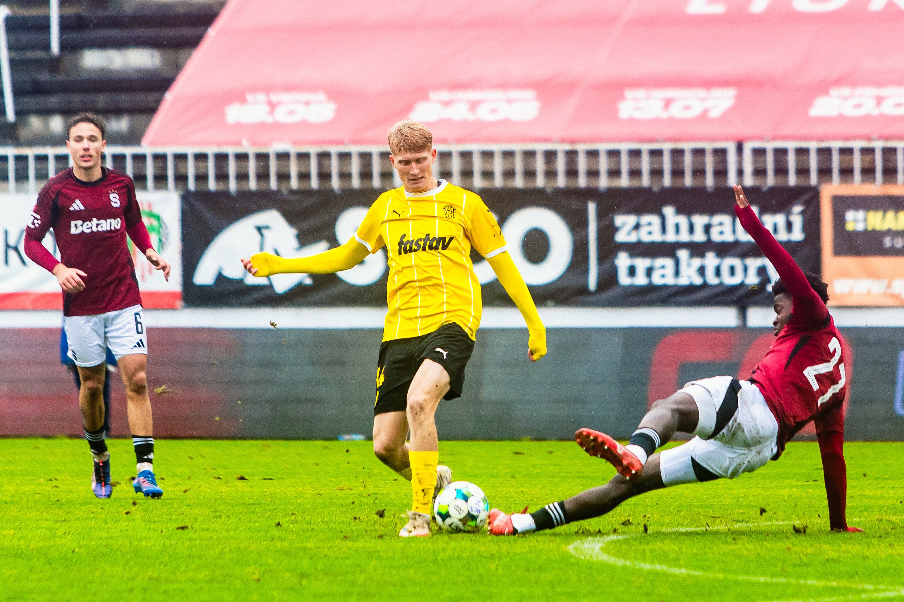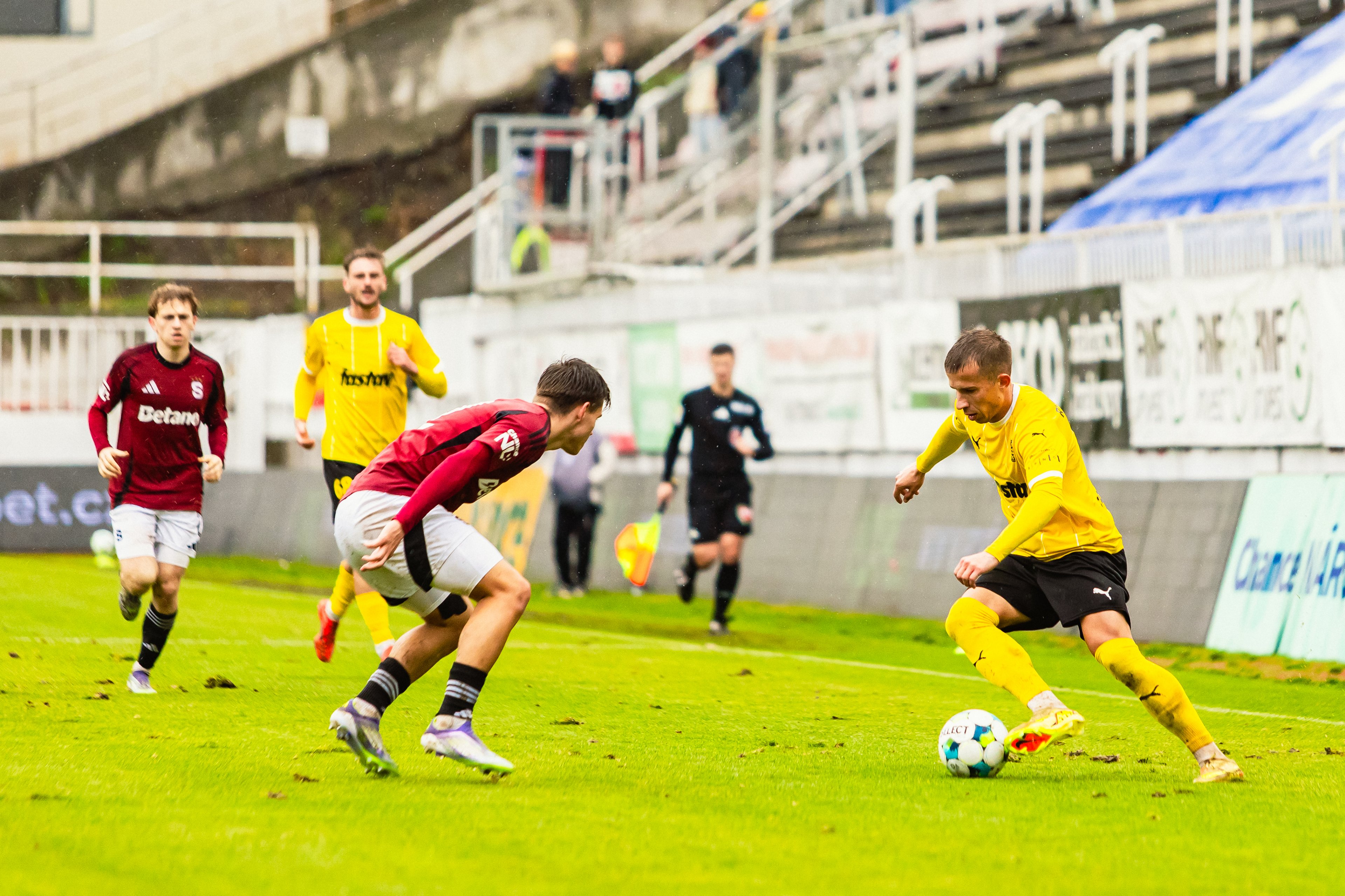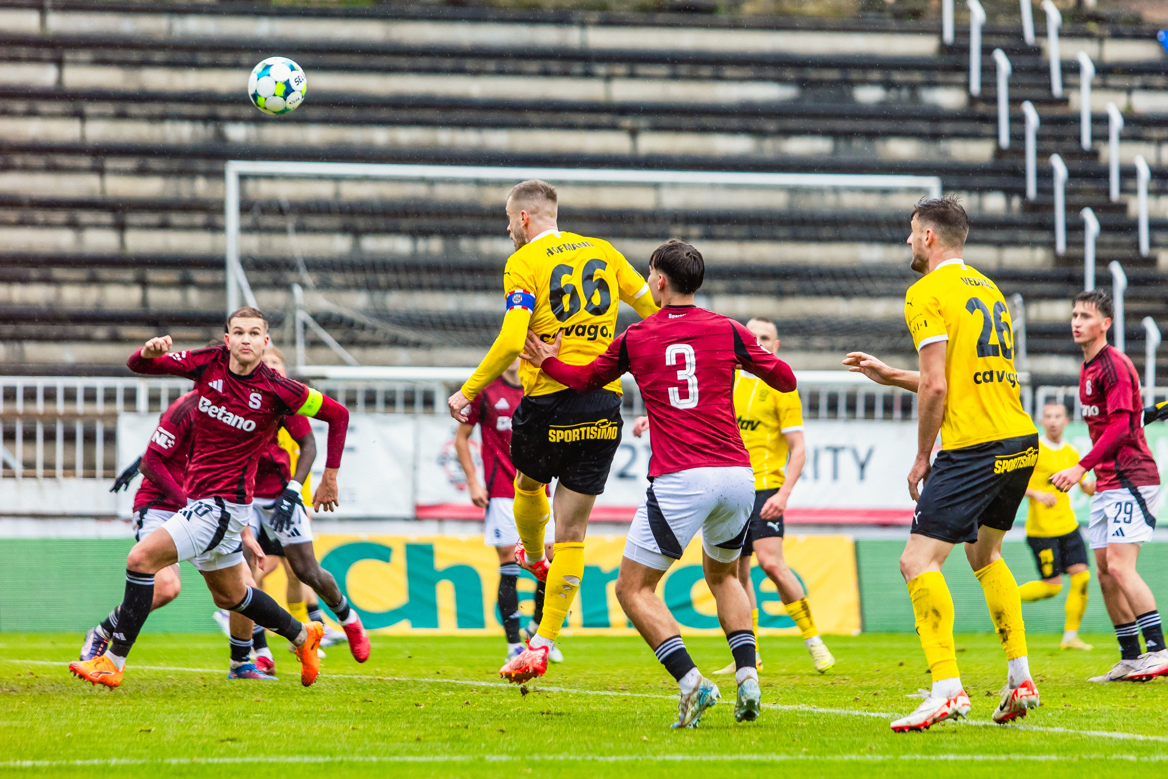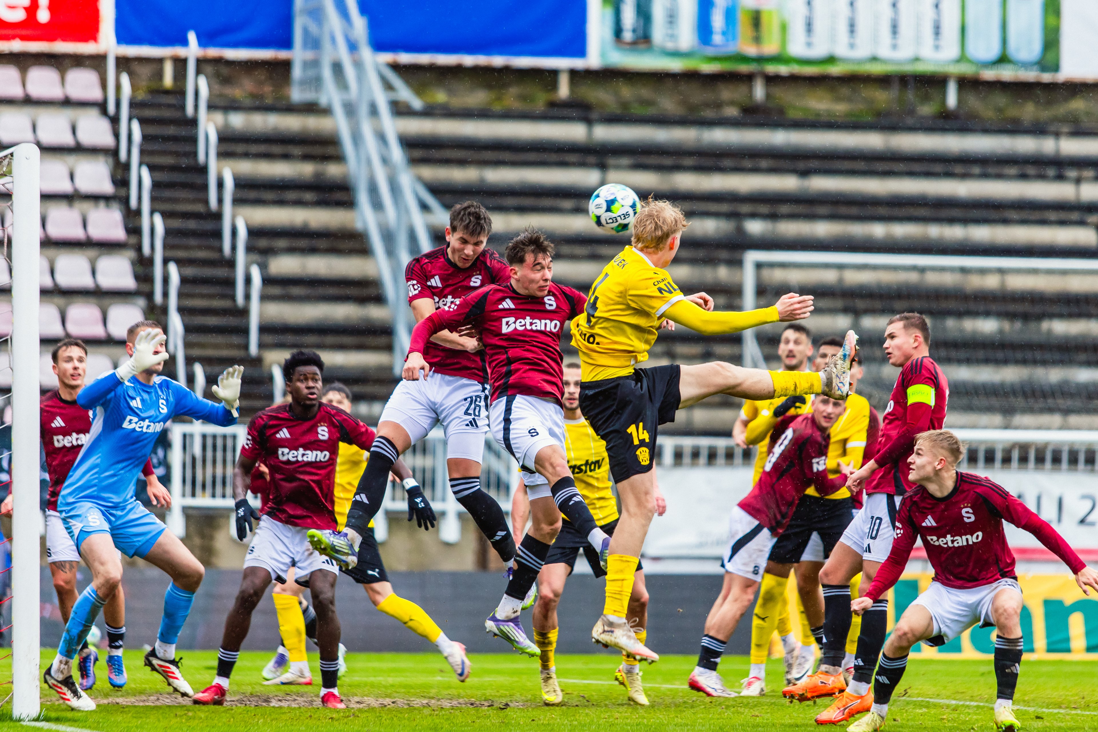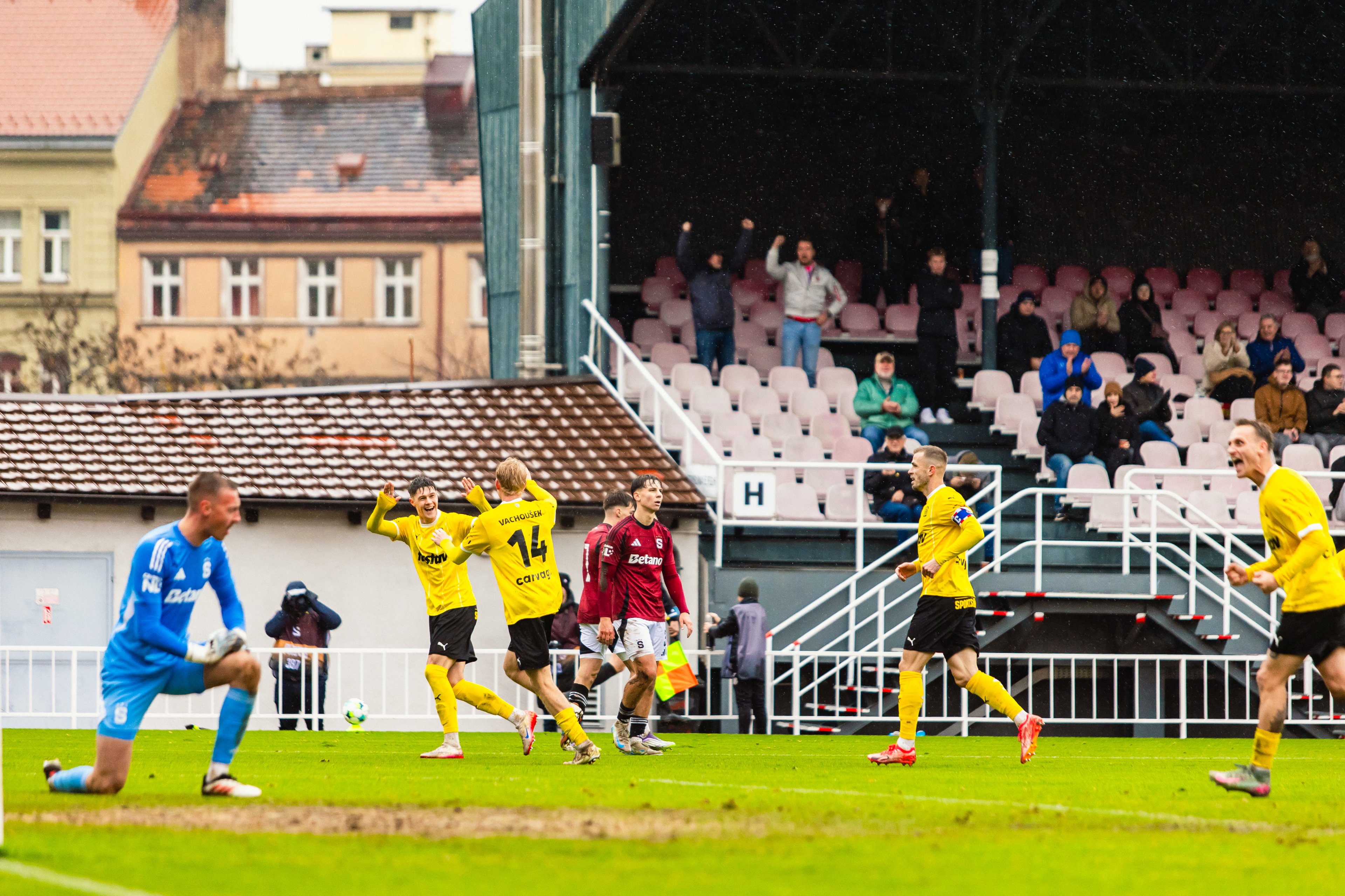 Z následného rohu už však hosté udeřili, a zúročili tak svůj velký tlak. Po zblokované střele Velicha se míč odrazil před vápno k Martinu Rymarenkovi, jehož rána se otřela o obránce a změnila směr do protipohybu padajícího brankáře - 0:1.